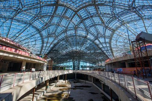 最终,核心区屋顶屋盖钢结构投影面积达18万平方米,但仅以8根C型柱为主要支撑,C型柱间距达200米。整个核心区屋顶由63450根杆件和12300个球节点拼装而成。